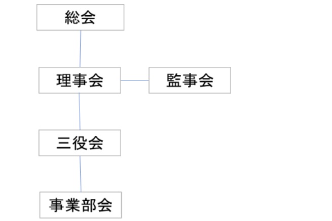 ※三役会は「理事長」「専務理事」「総務」で組織されます ※事業部会は「青年部」「代払事業部」「食堂売店事業部・共同購入事業部」「教育広報事業部」があります